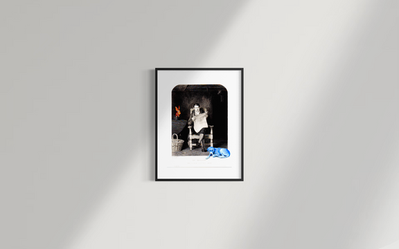 Este print nace de esa obsesión por rastrear librerías antiguas en cada viaje, rescatando grabados que alguna vez ilustraron libros olvidados. En esta pieza, Daniela Mejía interrumpe el silencio del siglo XIX con un "glitch" cromático: un perro azul eléctrico y un conejo naranja neón.