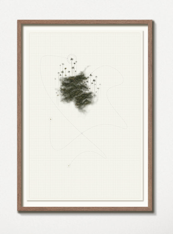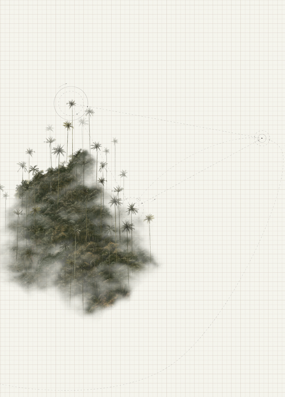 Fragmentos de paisaje natural —los cerros orientales y las palmas de cera del Valle del Cocora— se enlazan con trazos de vuelo, como si la memoria de las aves dibujara un mapa invisible en la bruma. Entre la densidad del follaje y la geometría de las líneas se abre un territorio en tránsito, un espacio que no pertenece a un lugar fijo sino al movimiento mismo. Esta unión evoca el gesto de emigrar: habitar entre orígenes y destinos, hallar hogar en lo que se desplaza y comprender que la pertenencia puede ser también un recorrido.