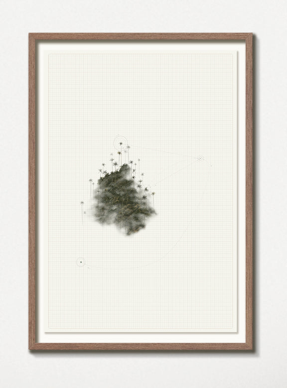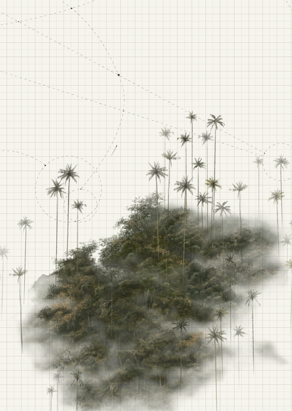 Fragmentos de paisaje natural —los cerros orientales y las palmas de cera del Valle del Cocora— se enlazan con trazos de vuelo, como si la memoria de las aves dibujara un mapa invisible en la bruma. Entre la densidad del follaje y la geometría de las líneas se abre un territorio en tránsito, un espacio que no pertenece a un lugar fijo sino al movimiento mismo. Esta unión evoca el gesto de emigrar: habitar entre orígenes y destinos, hallar hogar en lo que se desplaza y comprender que la pertenencia puede ser también un recorrido.