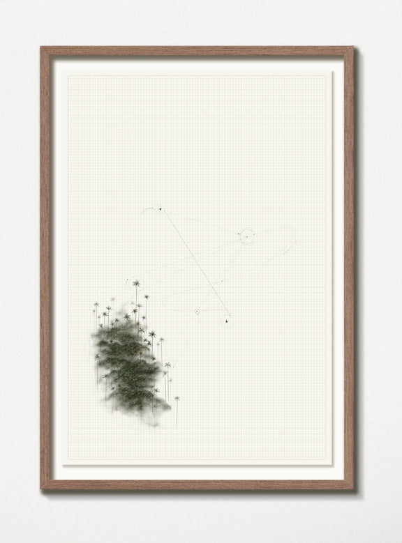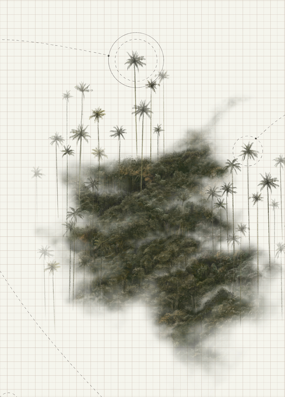Fragmentos de paisaje natural —los cerros orientales y las palmas de cera del Valle del Cocora— se enlazan con trazos de vuelo, como si la memoria de las aves dibujara un mapa invisible en la bruma. Entre la densidad del follaje y la geometría de las líneas se abre un territorio en tránsito, un espacio que no pertenece a un lugar fijo sino al movimiento mismo. Esta unión evoca el gesto de emigrar: habitar entre orígenes y destinos, hallar hogar en lo que se desplaza y comprender que la pertenencia puede ser también un recorrido.