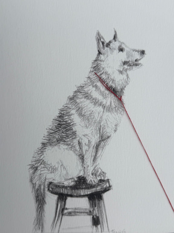 Empezó como un dibujo a lápiz. Después de una cuidadosa digitalización e impresión de altísima calidad, Alarcón fue enredando despacio al sujeto de esta obra, con hilo y aguja.