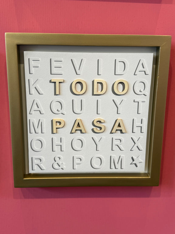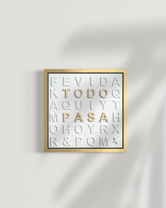 Materiales y Acabado: Impresión sobre papel 100% algodón con letras de madera sobrepuestas. ⚠️ Nota: La posición de las letras sobrepuestas varía de obra a obra.